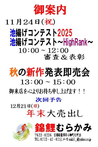 11/24(祝)は池揚げコンテストの審査&秋の売り出し2ndです!2025/11/17 以前に予告しておりました通り、上記日程でイベントを行います。 24(祝)は是非ともご来店くださいませ!! 尚、当日の朝は準備がありますので、出来るだけ9時半以降でのご来店でお願い致します。 それより前にお越しいただいてもご対応できない可能性があります。 またイベント進行の遅れにもつながりますので、何卒ご協力をお願い申し上げます。